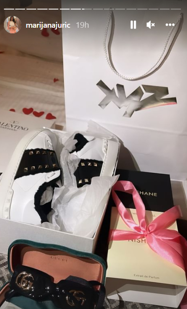 Na svom storyju pokazala je i skupocjene poklone koje je dobila. Između ostalog fotografirala je Nishane parfem, Guccijeve sunčane naočale i patike modne kuće Valentino koje koštaju oko 1000 KM.