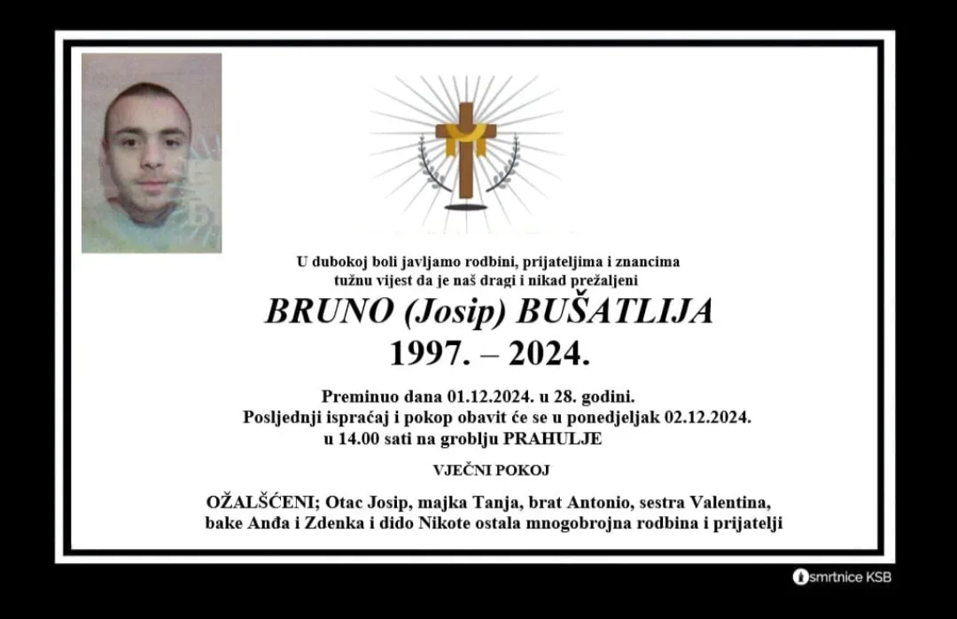 TUGA U SREDIŠNJOJ BOSNI Preminuo mladić (1997.) pro 1, 2024 | Vijesti nedjelju 1. prosinca 2024. godine u 28. godini života preminuo je Bruno (Josip) Bušatlija iz Travnika. Posljednji ispraćaj i ukop obavit će se u ponedjeljak 2. prosinca u 14:00 sati na groblju Prahulje. Počivao u miru Božjem!
